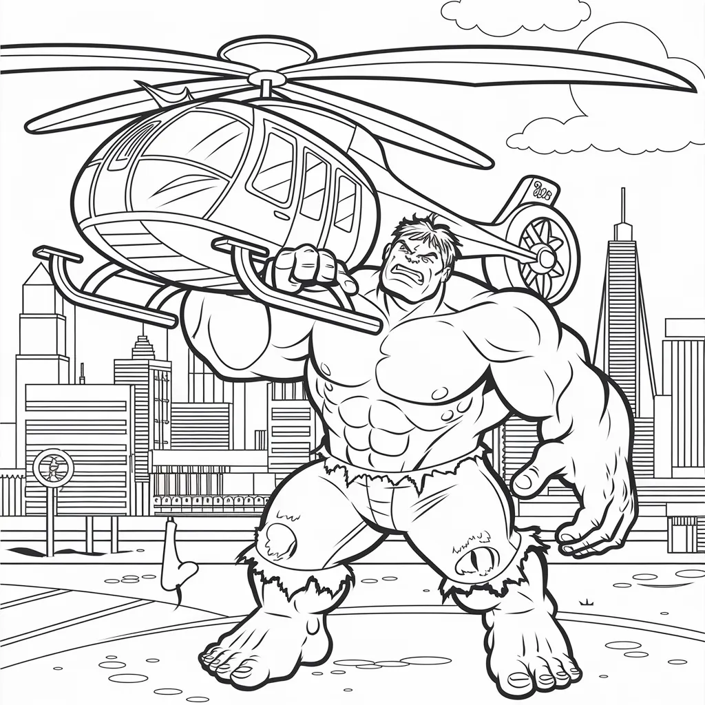 Gambar Hulk yang mencapai helikopter, menambah detail dan variasi objek untuk diwarnai.