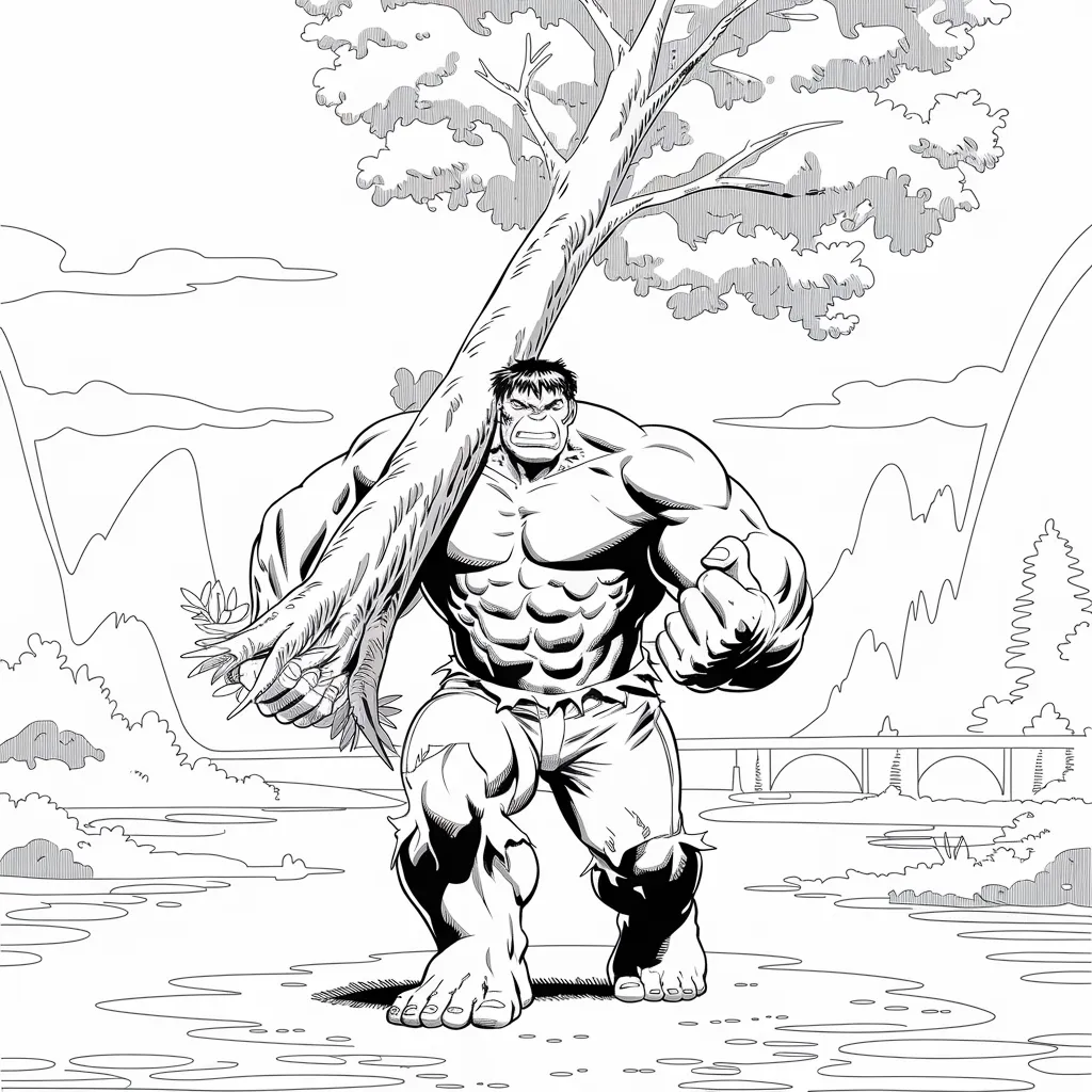 Gambar Hulk yang membawa pohon besar, menunjukkan kekuatannya dan menambah detail alam.