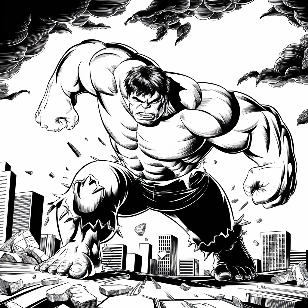 Gambar Hulk di tengah kota dengan gedung-gedung tinggi, menambah elemen urban dalam mewarnai.