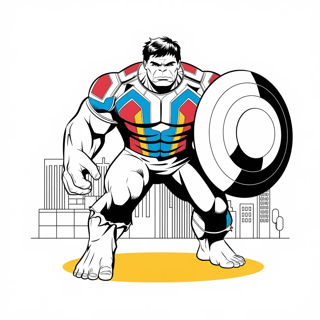 Gambar Hulk yang memegang tameng, memberikan kesempatan untuk mewarnai aksesori tambahan.