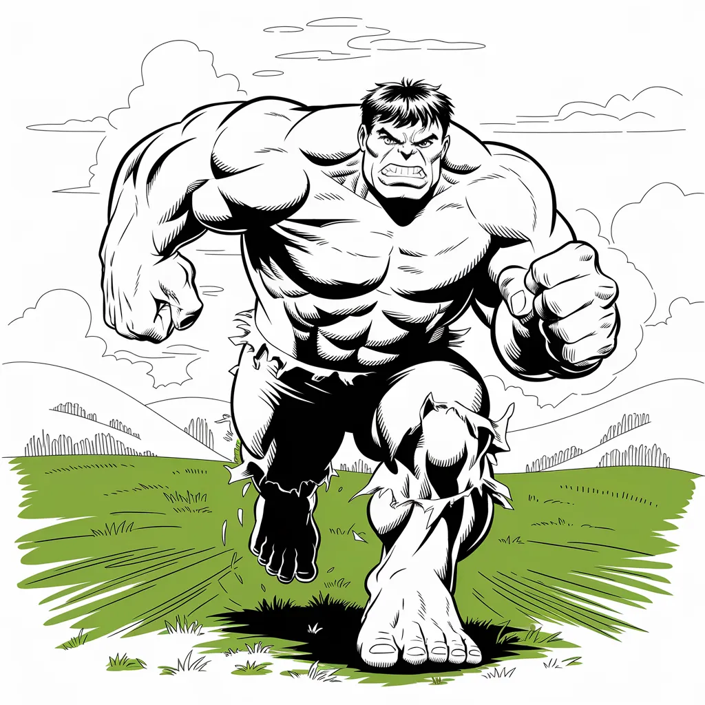 Ilustrasi Hulk yang berlari cepat, menampilkan gerakan dan energi, cocok untuk mewarnai latar belakang yang dinamis.
