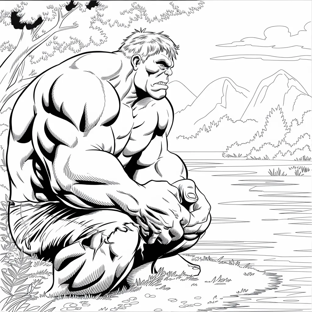 Gambar Hulk yang duduk dengan tenang, menampilkan sisi reflektif dan memungkinkan penggunaan warna yang lebih lembut.