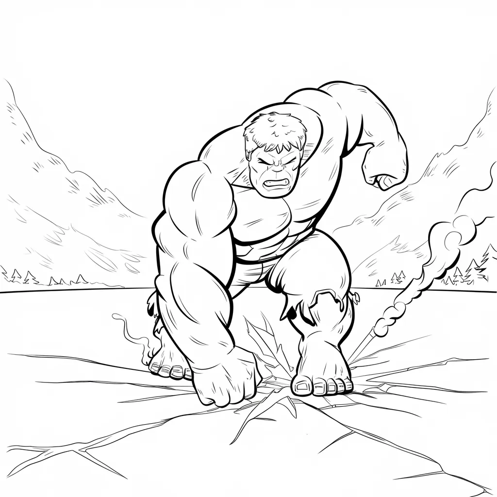 Gambar Hulk yang meninju tanah hingga retak, menampilkan efek kekuatan dan memberikan detail menarik hingga warnanya.