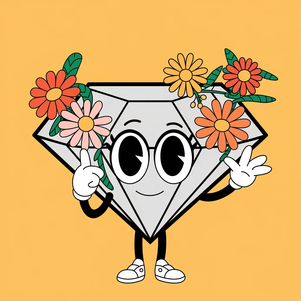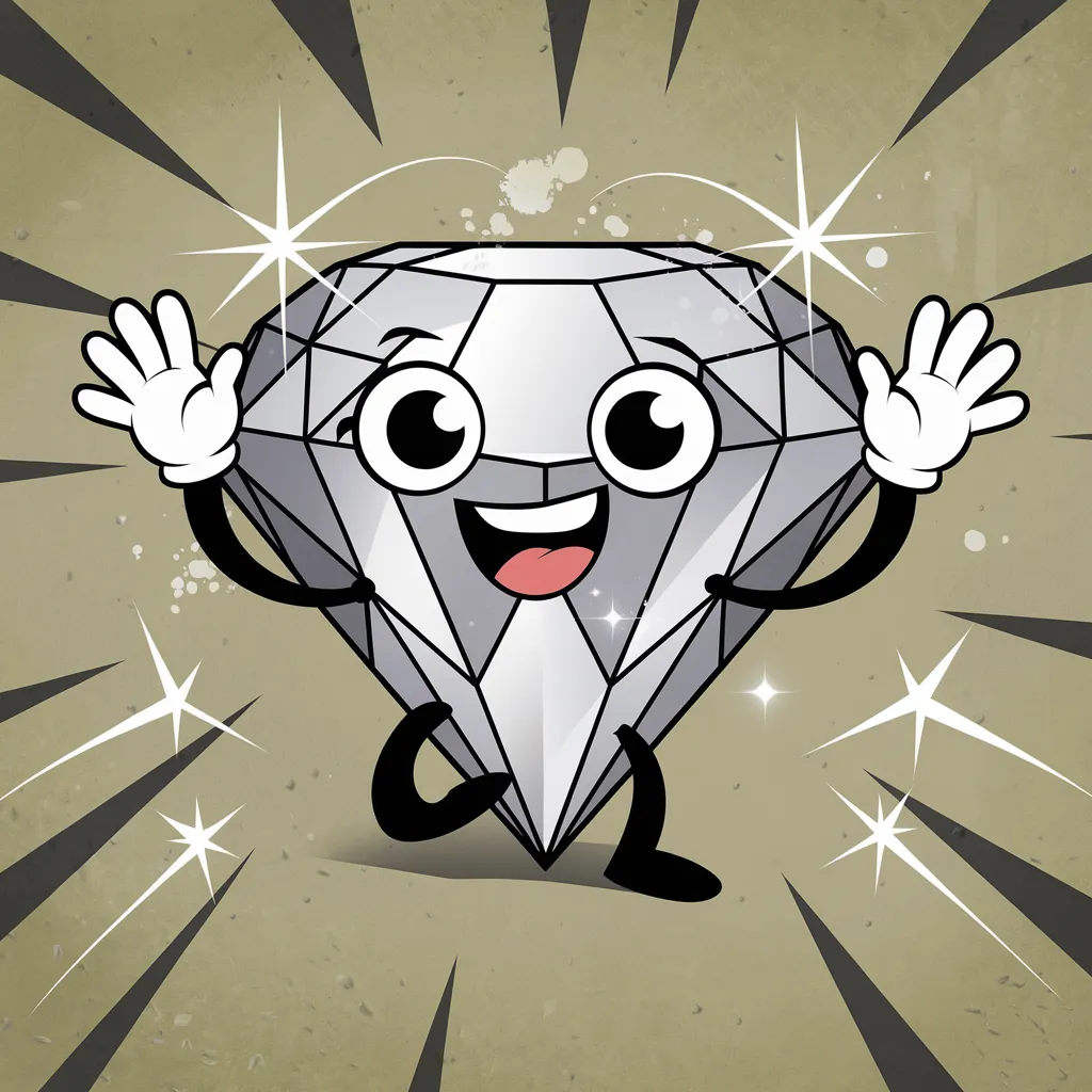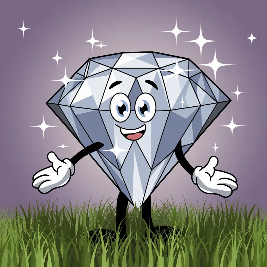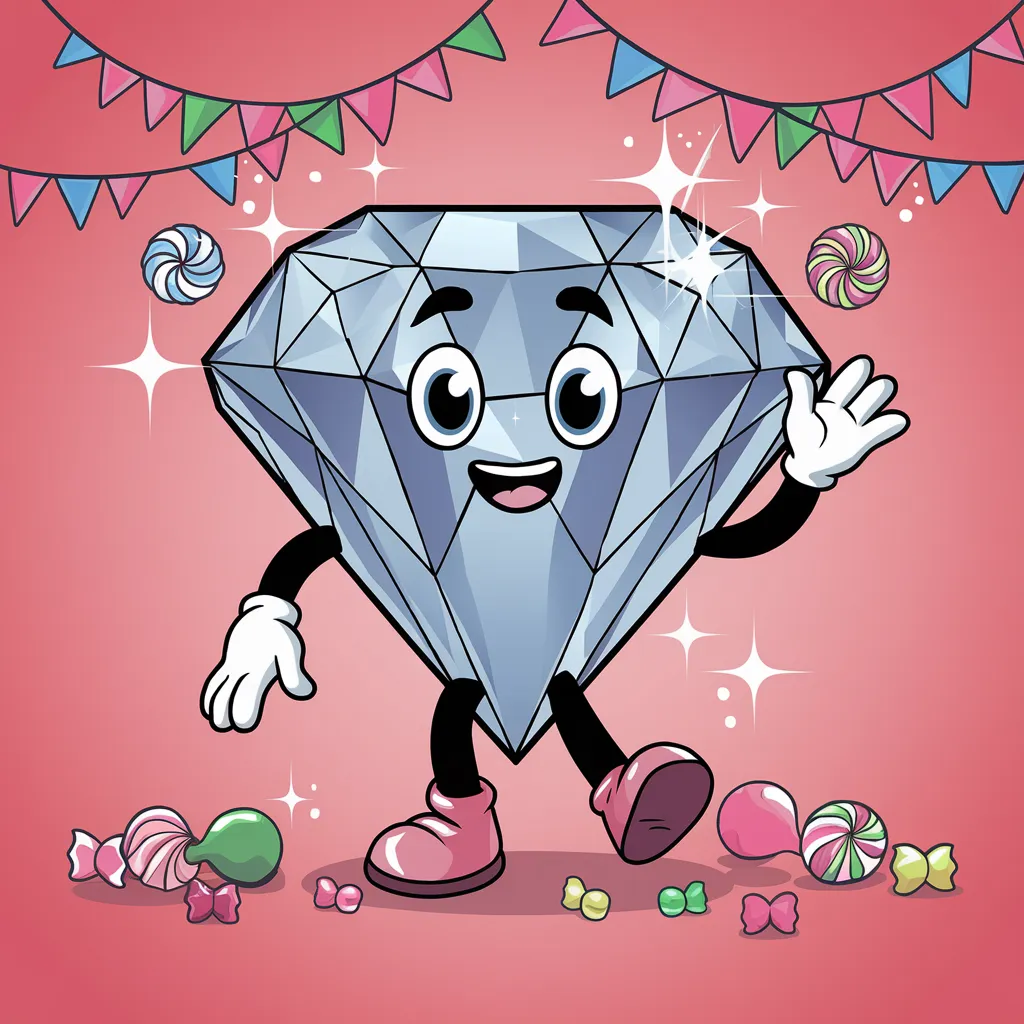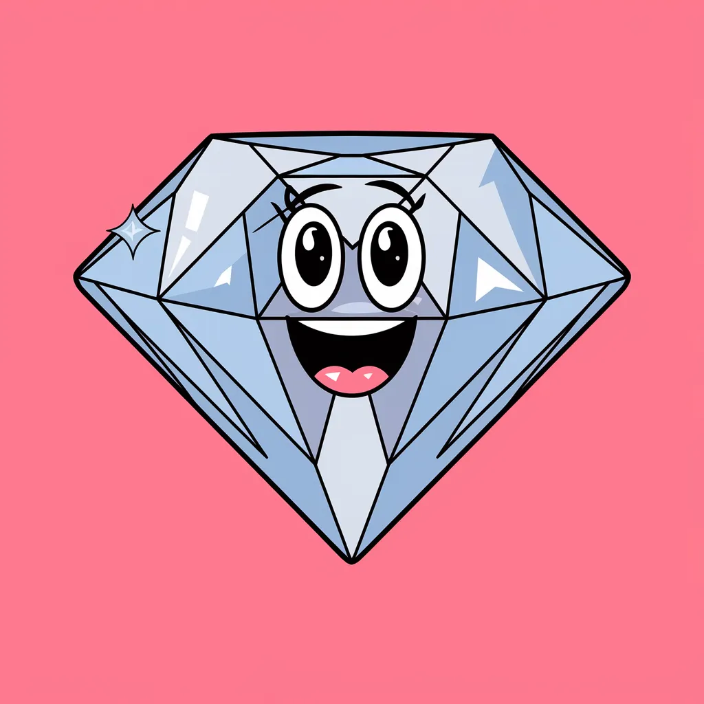 Gambarkan berlian yang memiliki wajah ceria dengan mata besar dan senyum lebar, memberikan kesan lucu dan ramah.