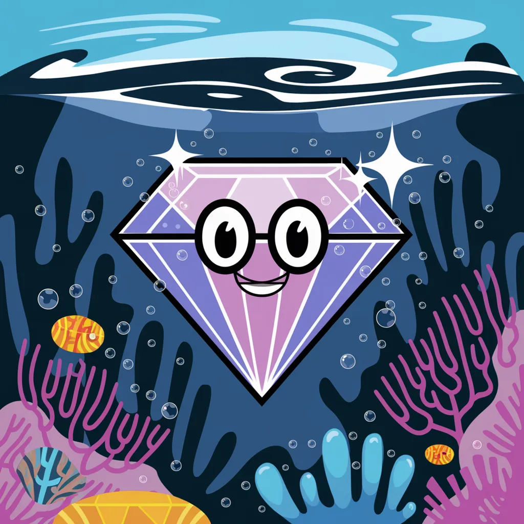 Ilustrasikan berlian yang berada di tengah lautan dengan latar belakang ombak dan hewan laut, menciptakan suasana petualangan.