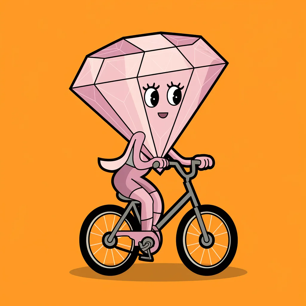 Ilustrasikan berlian yang sedang mengendarai sepeda dengan perlengkapan keselamatan lengkap, menunjukkan gerakan aktif dan energik.
