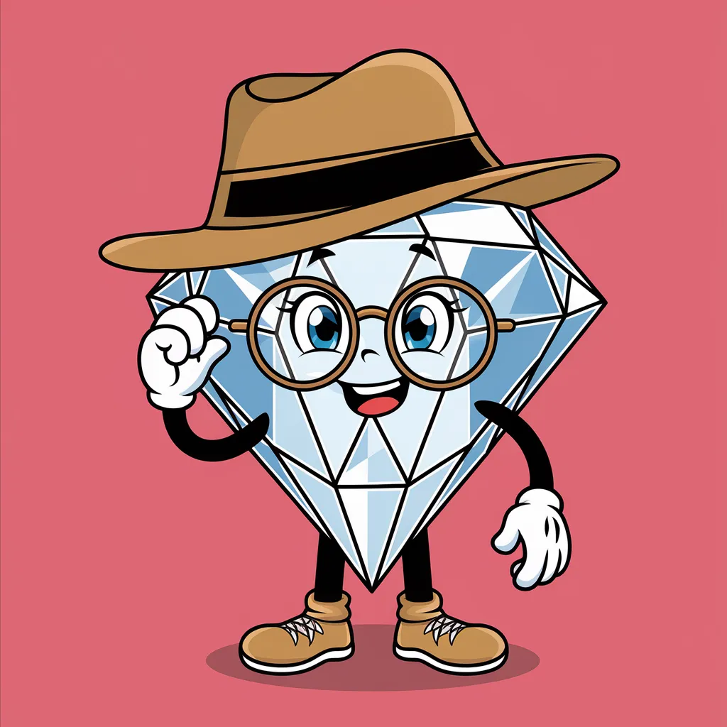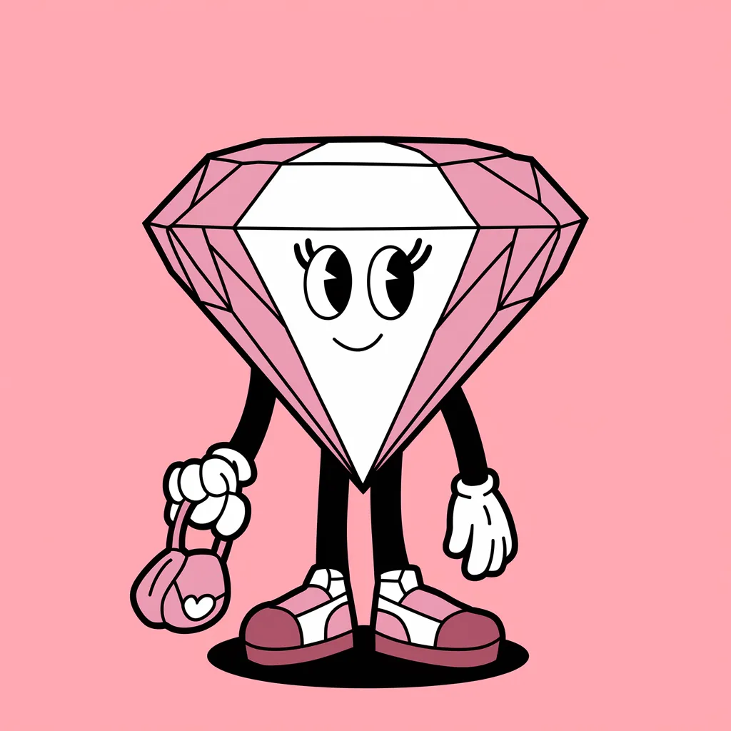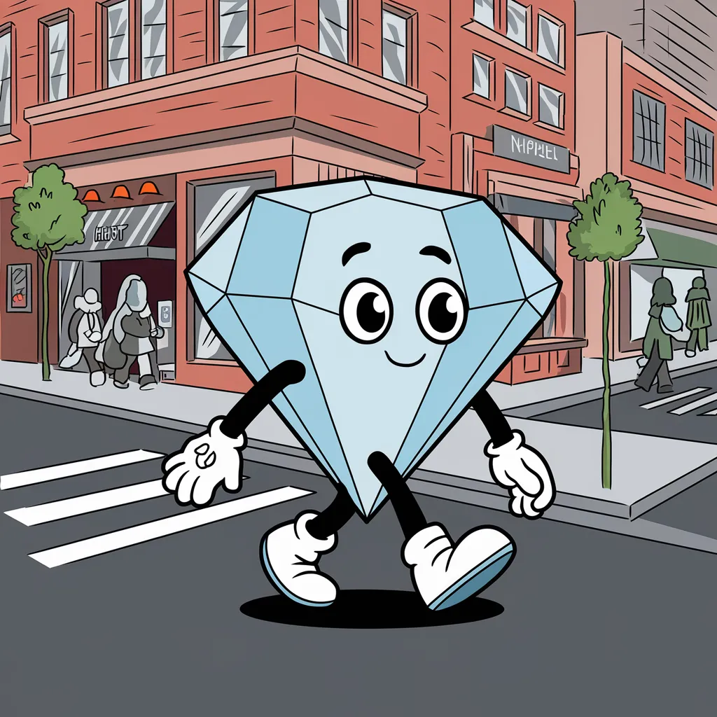 Gambarkan berlian yang sedang berjalan di jalanan kota dengan aksesoris seperti kacamata hitam dan tas kecil, memberikan kesan modern dan bergaya.