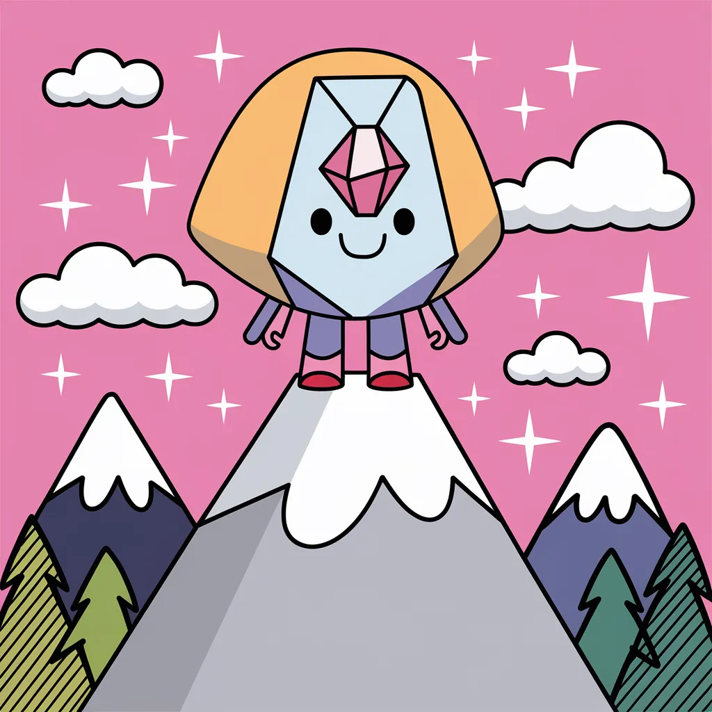 Gambarkan berlian yang berdiri di puncak gunung dengan latar belakang langit cerah dan awan putih, menciptakan kesan pencapaian dan petualangan.