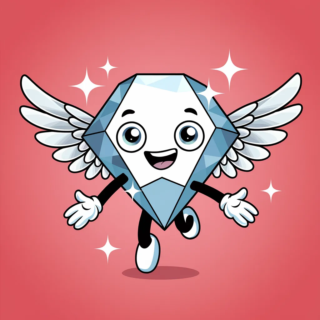Ilustrasikan berlian yang sedang terbang dengan sayap, memberikan kesan kebebasan dan keindahan.