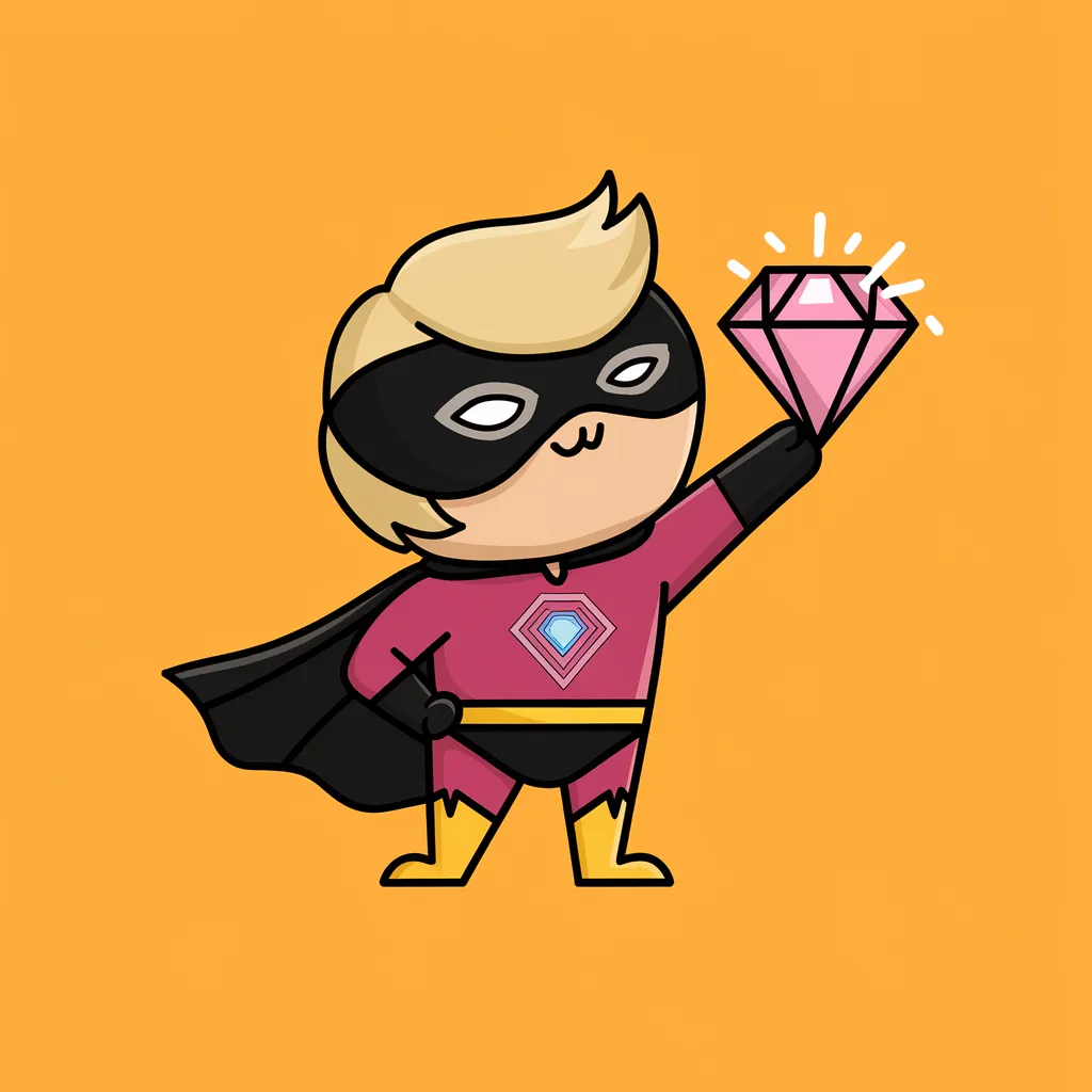 Ilustrasikan berlian yang mengenakan kostum superhero lengkap dengan jubah dan topeng, siap melindungi dunia dari kejahatan.