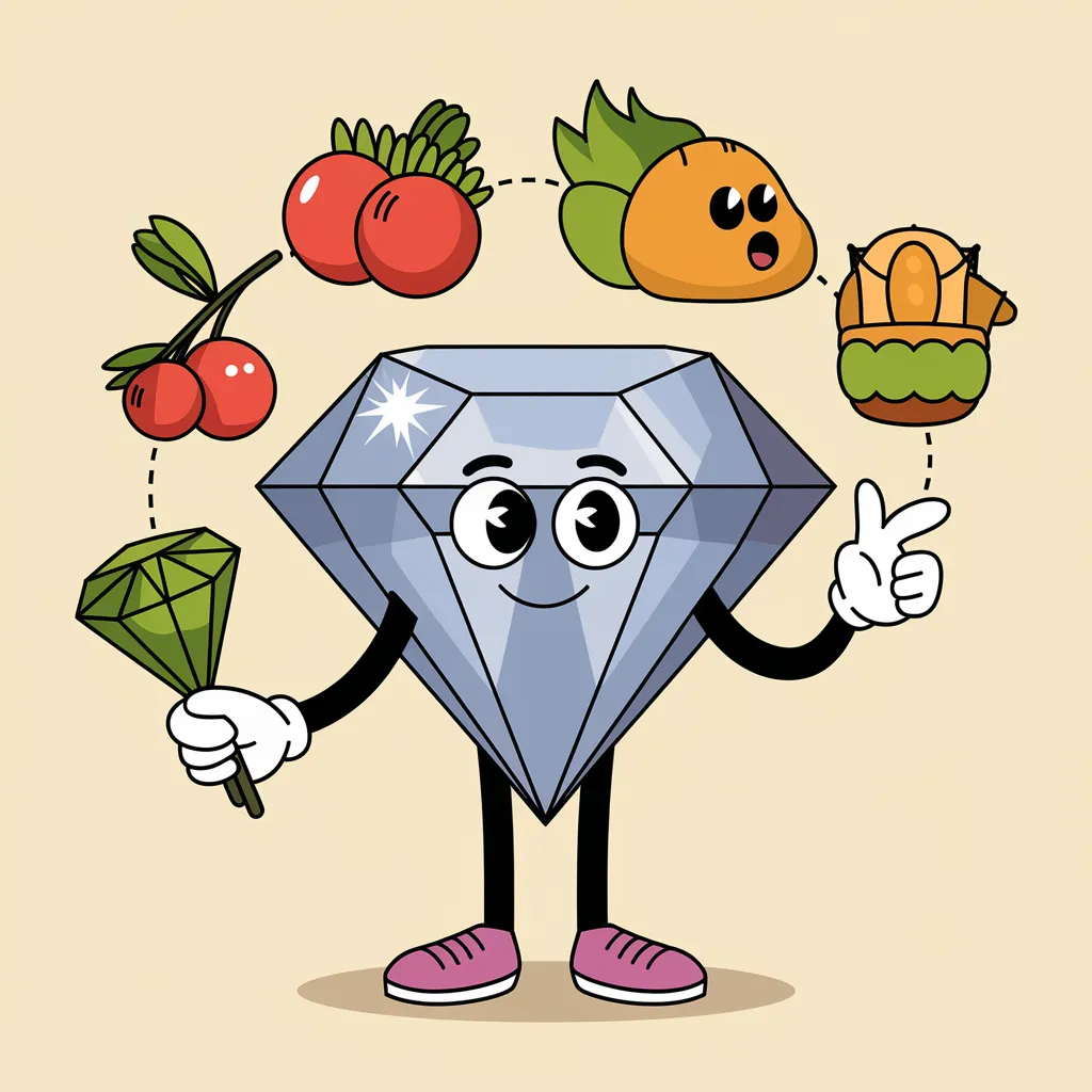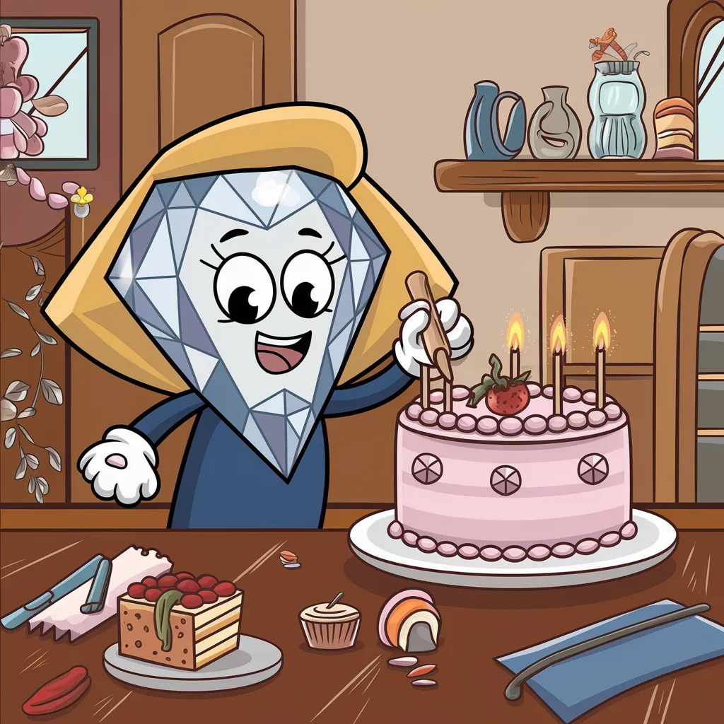 Ilustrasikan berlian yang sedang menghias kue dengan piping dan hiasan kecil, memberikan sentuhan kreatif dan festif.