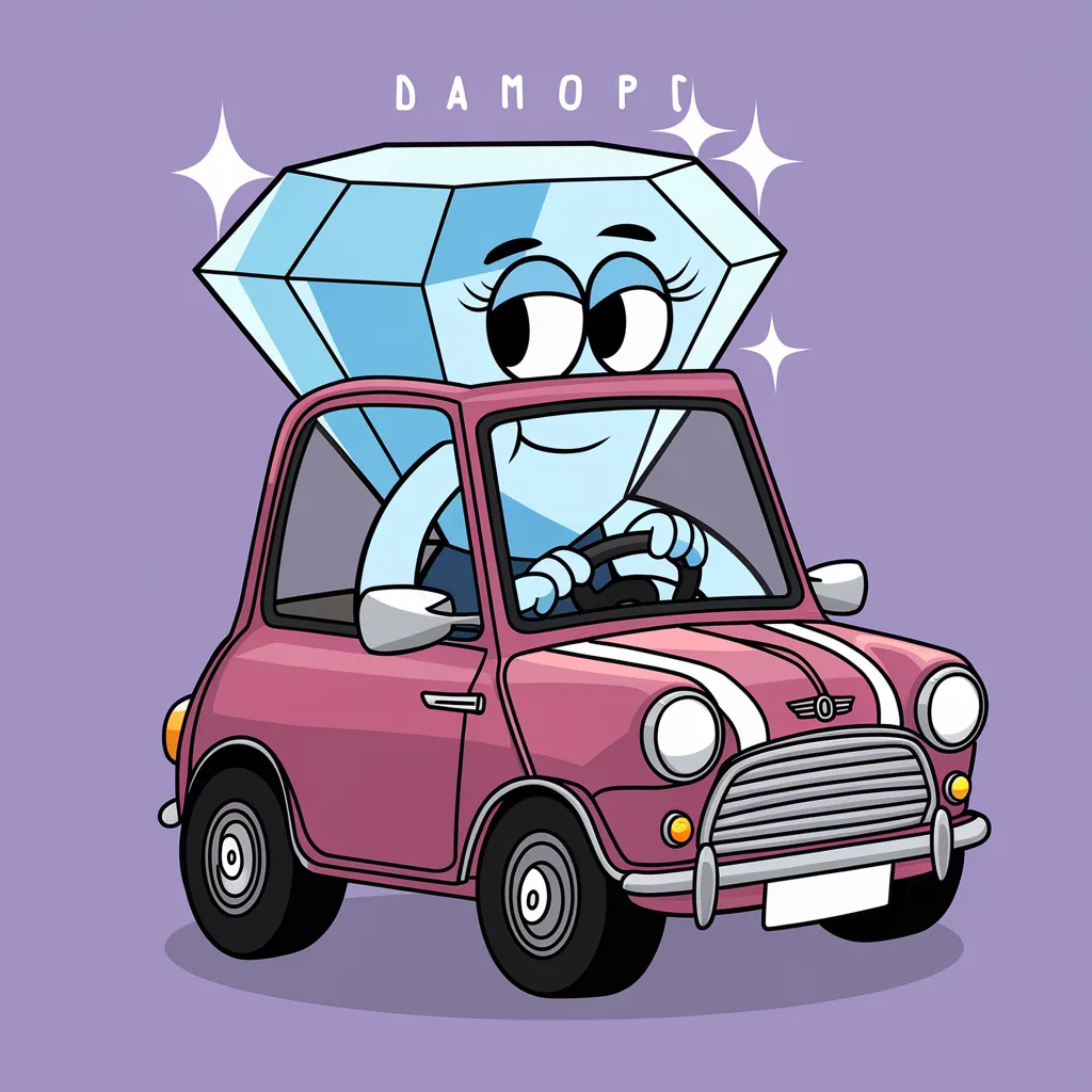 Ilustrasikan berlian yang sedang mengendarai mobil mini di jalan setapak taman, menambah kesan dinamis dan menyenangkan.