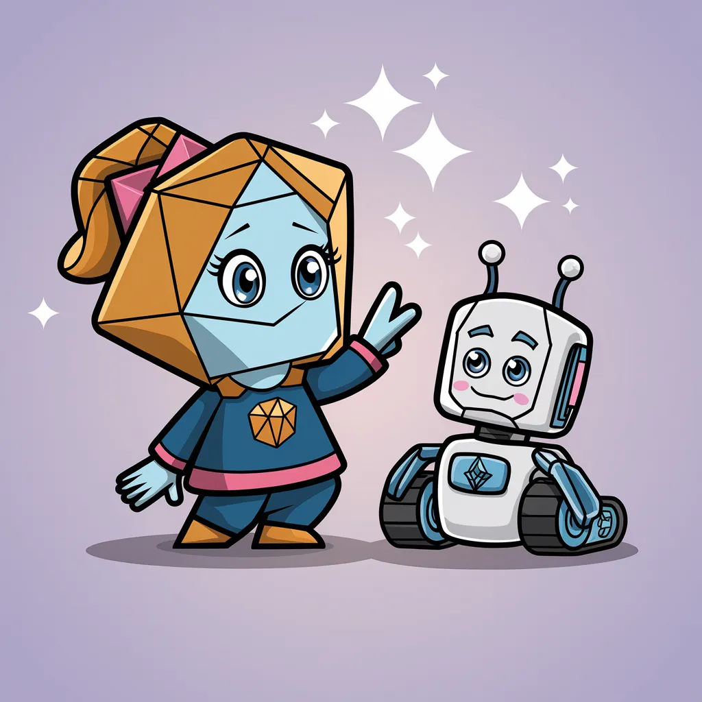 Ilustrasikan hubungan persahabatan antara berlian dan robot kecil, menunjukkan interaksi antara alam dan teknologi.