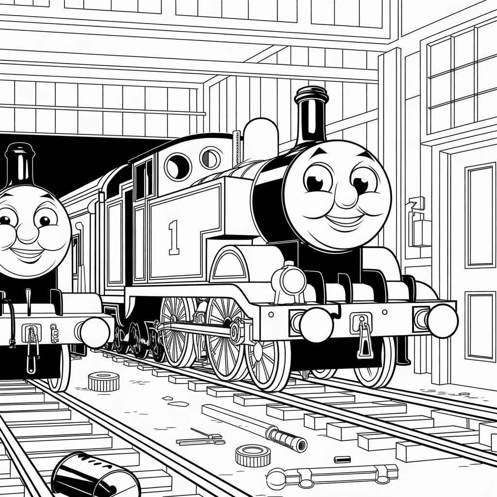 Gambar Thomas dalam depot lokomotif, beberapa rel lain di samping, tempat perawatan.