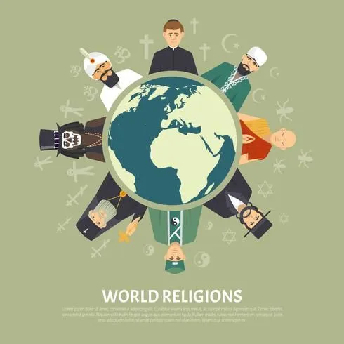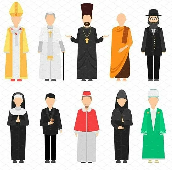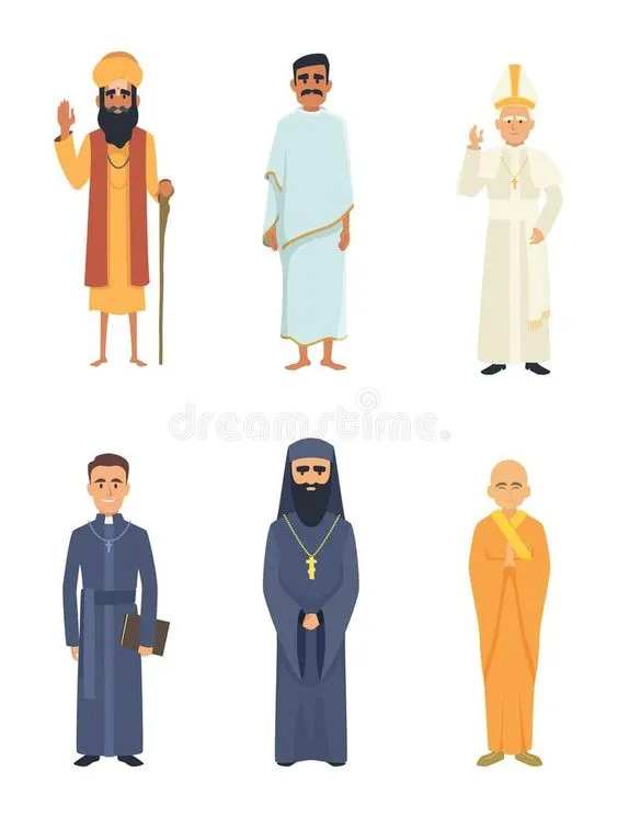 Dalam gambar tersebut, setiap tokoh agama mungkin diwakili oleh para pemuka agama atau tokoh-tokoh spiritual yang berbeda, seperti seorang imam, pendeta, biksu, pandit, atau pemimpin lainnya dari berbagai keyakinan. Masing-masing tokoh agama tersebut mungkin mengenakan pakaian khas dari agamanya dan mungkin juga memiliki simbol-simbol agama yang khas, seperti salib, bulan sabit, om, atau simbol lainnya.