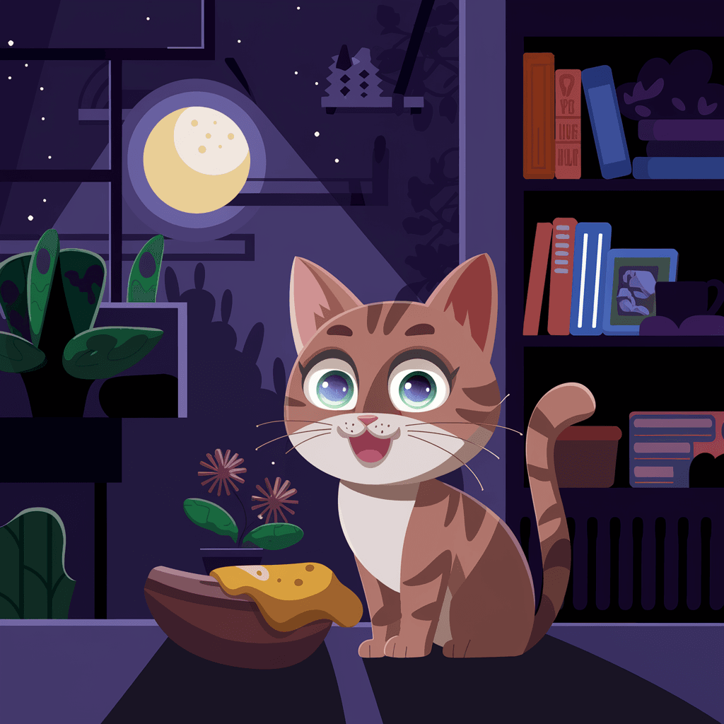 Ilustrasi kucing yang berdiri di bawah cahaya bulan dan bintang-bintang, menciptakan kesan misterius dan tenang.