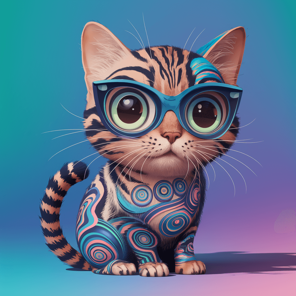 Ilustrasi kucing yang memiliki pola spiral di tubuhnya, menciptakan tampilan yang unik dan artistik.