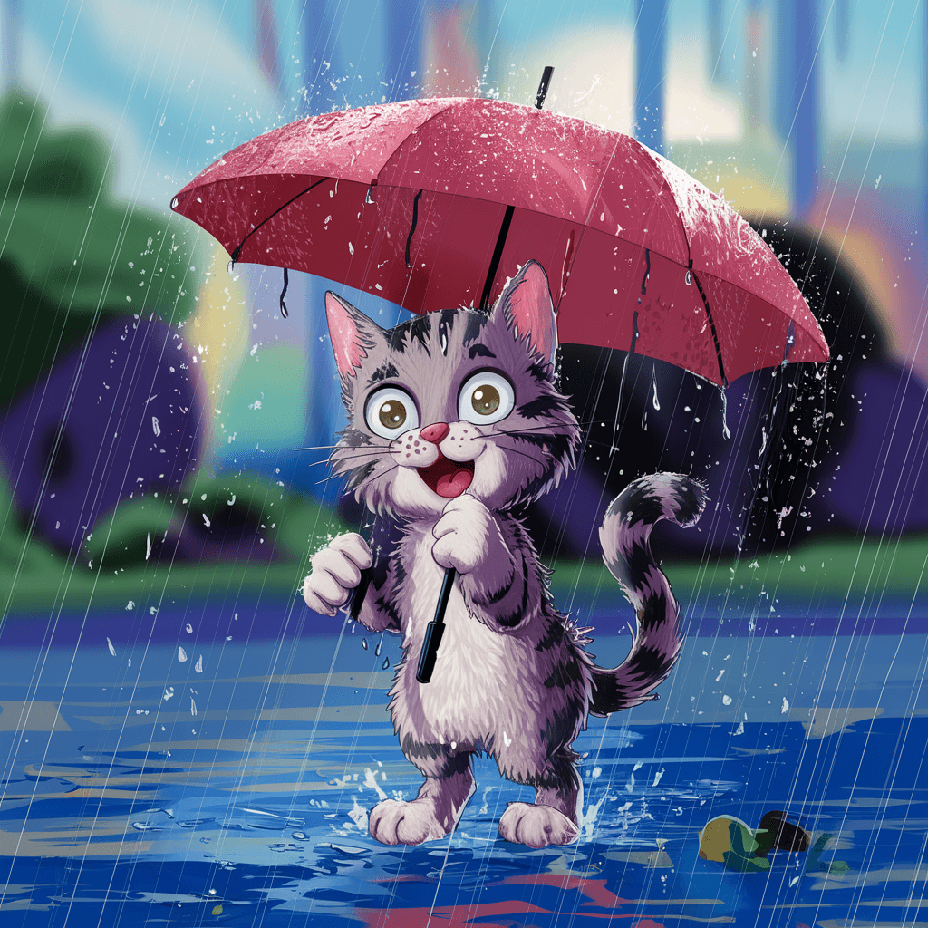 Gambar kucing yang sedang diselimuti hujan gerimis, menciptakan suasana yang tenang dan melankolis.