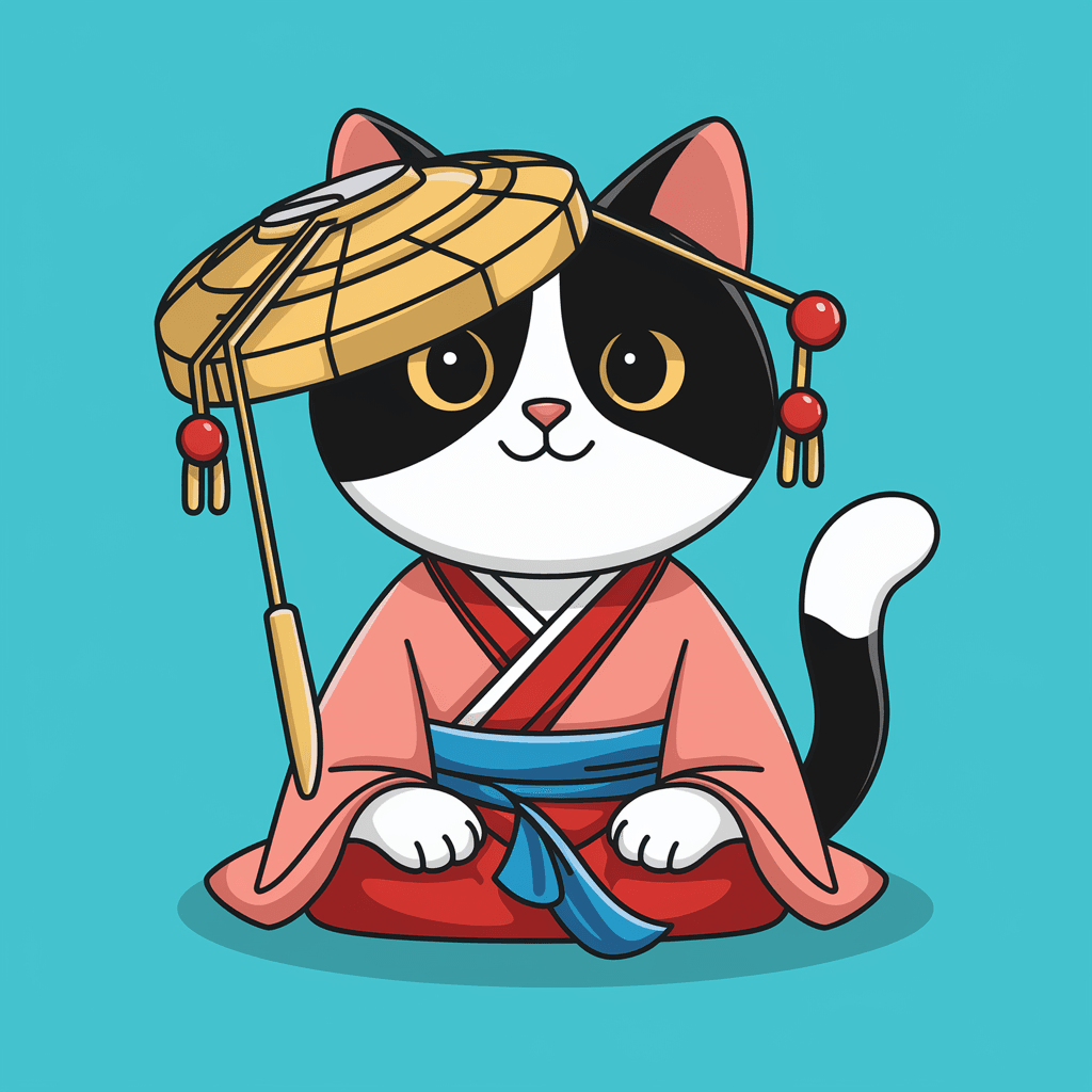 Ilustrasi kucing yang mengenakan topi atau aksesori modis, memberikan sentuhan gaya dan kepribadian.
