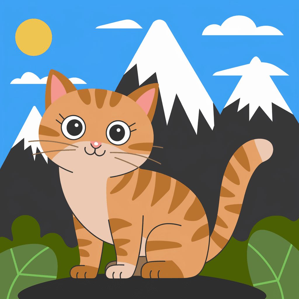 Gambar kucing yang berdiri di depan pemandangan pegunungan yang menjulang tinggi, menciptakan kesan heroik dan inspiratif.