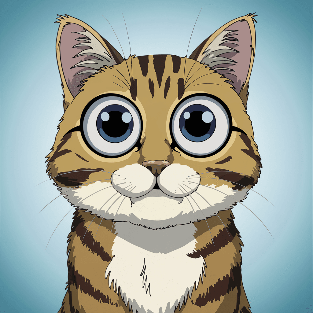 Gambar kucing dengan gaya kartun yang memiliki mata besar dan ekspresif, memberikan tampilan yang lucu dan menarik.