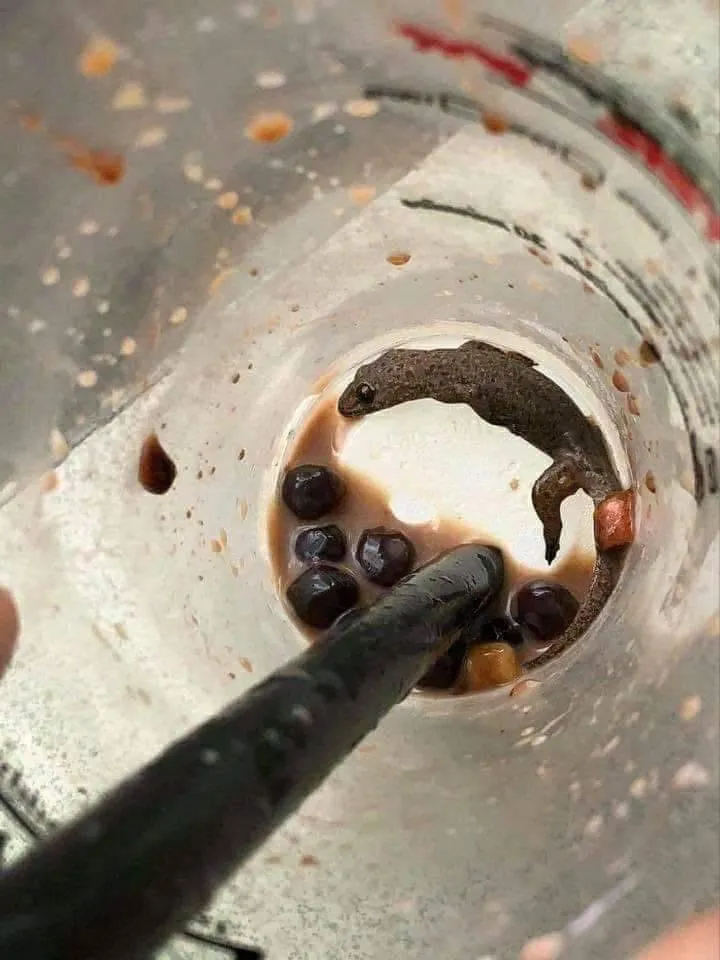 Kesan tampilan gambar tersebut bisa menggambarkan momen yang lucu dan mengejutkan ketika sebutir cicak masuk ke dalam minuman boba. Cicak yang secara tidak sengaja masuk ke dalam minuman bisa menciptakan situasi yang kocak dan mengundang tawa. Gambar tersebut mungkin menggambarkan peristiwa yang tidak biasa dan menghibur, memberikan sentuhan humor pada minuman boba yang seharusnya biasa.