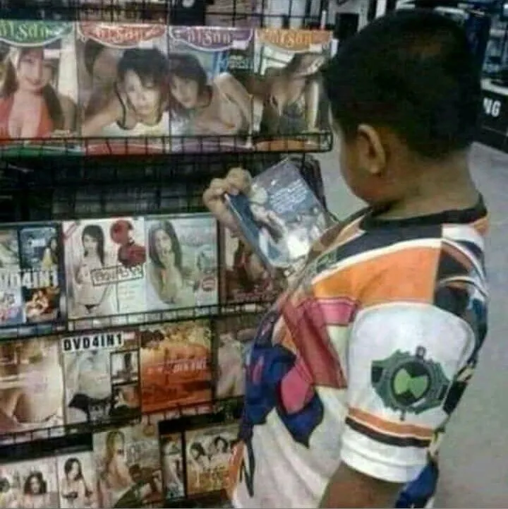 Adapun pada gambar diatas kalian akan dapat melihat gambar lucu seorang anak laki-laki gembul yang sedang melihat kaset-kaset film dewasa jepang, terdapat humor dan unsur fonografi pada gambar diatas.