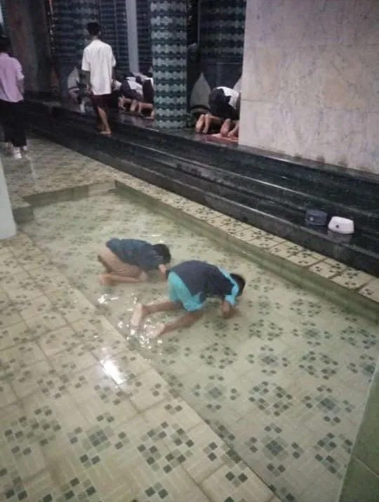 Adapun pada gambar diatas terdapat gambar lucu dua orang anak dalam kubangan air di tempat wudhu mesjid dengan fose seolah sujud. Mimin pikir gambar diatas mengandung humor yang menggelak tawa. Namun mereka tak seharusnya melakukan tindakan konyol tersebut.