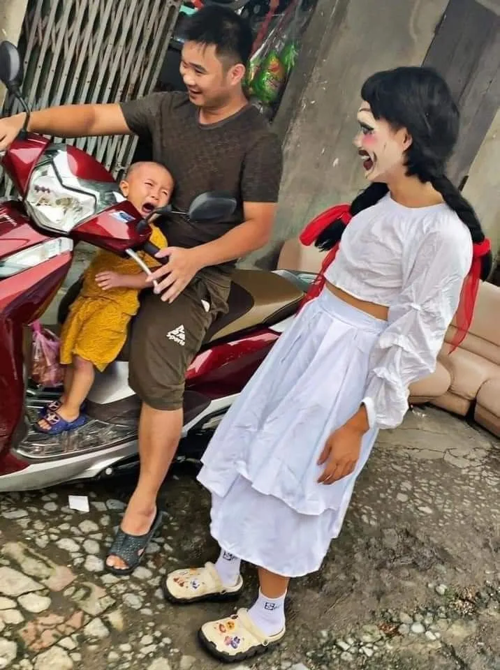 Kesan tampilan gambar lucu seorang anak kecil yang menangis melihat pria yang berdandan seperti boneka Annabelle adalah situasi yang menggambarkan campuran antara ketakutan dan humor. Gambar ini menciptakan kontras antara ekspresi ketakutan anak kecil dan penampilan lucu atau konyol pria yang berdandan seperti boneka Annabelle. Situasi ini bisa dianggap lucu karena anak kecil bereaksi secara berlebihan terhadap penampilan pria tersebut, yang sebenarnya hanya berusaha untuk menghibur atau bermain-main.