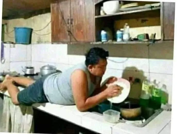 Kesan tampilan gambar lucu seorang pria sedang mencuci piring sambil rebahan di atas wastafel adalah situasi yang mengundang tawa dan menggambarkan tingkah laku yang tidak lazim. Gambar tersebut menciptakan kesan humor dengan memadukan dua aktivitas yang biasanya dilakukan secara terpisah, yaitu mencuci piring dan beristirahat. Situasi ini kontras karena mencuci piring adalah tugas yang memerlukan perhatian dan konsentrasi, sementara rebahan adalah kegiatan santai dan nyaman. Menggabungkan kedua aktivitas tersebut dalam satu gambar menciptakan kontradiksi yang lucu dan mengundang tawa.