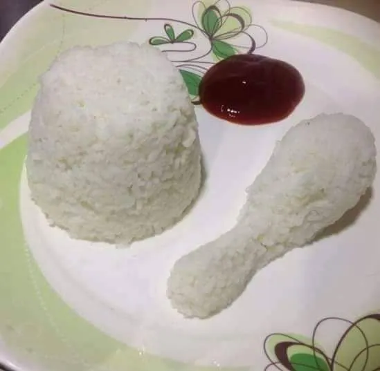 Kesan tampilan gambar lucu nasi putih dengan lauknya yang seharusnya ayam, namun malah nasi yang dibentuk layaknya paha ayam lengkap dengan saus, adalah kombinasi kreativitas dan humor yang mengundang tawa. Gambar tersebut mungkin menggambarkan nasi putih yang secara visual dibentuk dan dihidangkan seperti paha ayam dengan saus yang serupa.