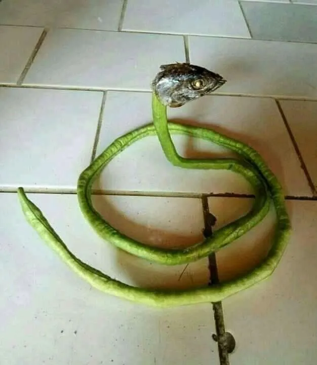 Di ujung kacang panjang, terdapat kepala ikan goreng dengan mata yang besar, mulut yang lebar, dan mungkin sirip yang mencolok. Kombinasi ini memberikan kesan yang mengundang tawa dan mungkin membuat orang terkejut. Kesan ini ditambah dengan kontras antara bentuk dan karakter sayuran dan ikan.