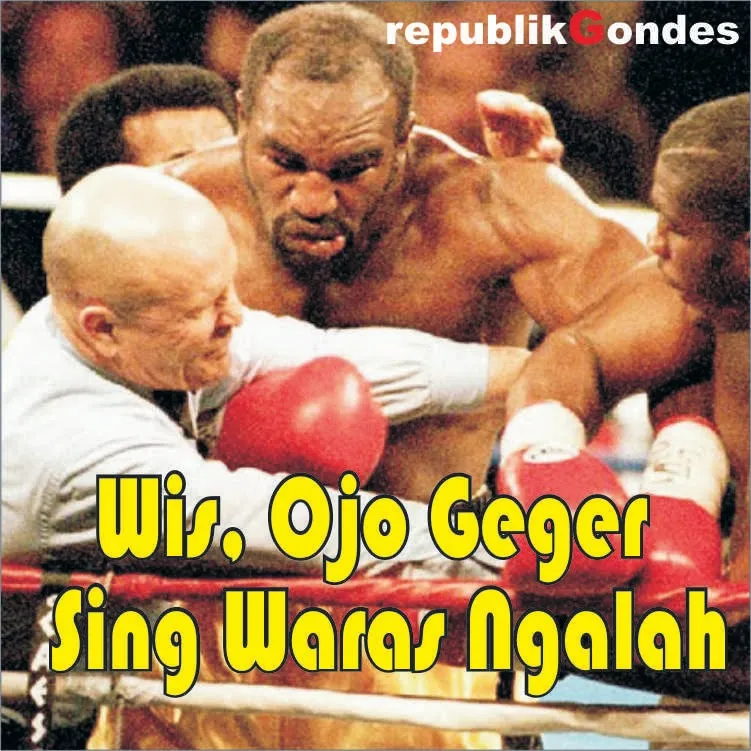 Gambar wasit yang sedang melerai petinju dengan caption “Wis ojo ceger seng waras ngalah” menggambarkan situasi di dalam sebuah pertandingan tinju yang sedang berlangsung. Kutipan tersebut dalam bahasa Jawa dapat diartikan sebagai “Jangan terlalu gegabah, yang bijaksana itu mengalah.” Kesan yang dihadirkan adalah ketegangan dan dinamika dalam pertandingan tinju, di mana wasit berusaha melerai para petinju yang sedang berduel agar tidak terjadi cedera yang serius.