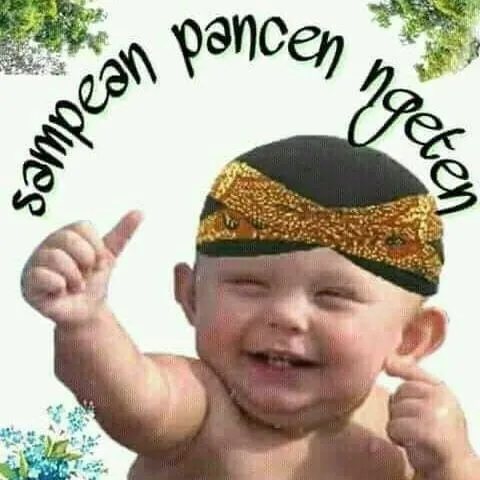Gambar tersebut dapat menunjukkan bayi yang terlihat cerdas dan lucu saat mengenakan blangkon, sebuah ikat kepala tradisional Jawa, serta mengacungkan jempol dengan ekspresi wajah yang menggemaskan. Kesan lucu dan menggemaskan ini akan membuat banyak orang tersenyum dan bahagia saat melihatnya, terutama bagi mereka yang mengerti bahasa Jawa dan bisa menangkap nuansa kocak dalam tulisan tersebut.