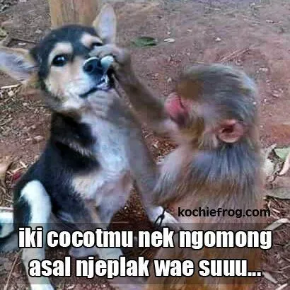 Sebuah gambar lucu yang menampilkan anjing dan monyet, lengkap dengan tulisan dalam bahasa Jawa “Iki cocotmu, nek ngomong asal njeplak wae suu,” menciptakan kesan humor dan menggemaskan. Gambar ini menggambarkan anjing dan monyet dalam situasi yang menggelitik dan dapat membuat orang tersenyum. Tulisan dalam bahasa Jawa menambahkan sentuhan lokal pada gambar ini, dan kalimat yang mengandung kata-kata seperti “cocot” (berbicara) dan “njeplak” (asal menyebutkan) menghadirkan nuansa khas bahasa Jawa yang kocak dan menghibur.