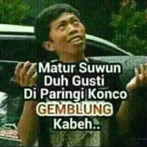 Gambar seorang pria dengan fose berdoa dan tulisan “Matur suwun, Duh Gusti, diparingi kuncu gemblung kabeh” menciptakan kesan spiritual dan mengandung nuansa kesantunan dalam bahasa Jawa. Pada gambar ini, pria tersebut terlihat dalam momen berdoa, dengan ekspresi wajah yang penuh harap dan tulus. Tulisan dalam bahasa Jawa, “Matur suwun, Duh Gusti, diparingi kuncu gemblung kabeh,” merupakan ungkapan rasa terima kasih dan permohonan kepada Tuhan. Kata-kata tersebut mengekspresikan rasa syukur atas segala berkah yang telah diberikan dan permohonan agar dijauhkan dari kesalahan atau kebingungan dalam hidup.
