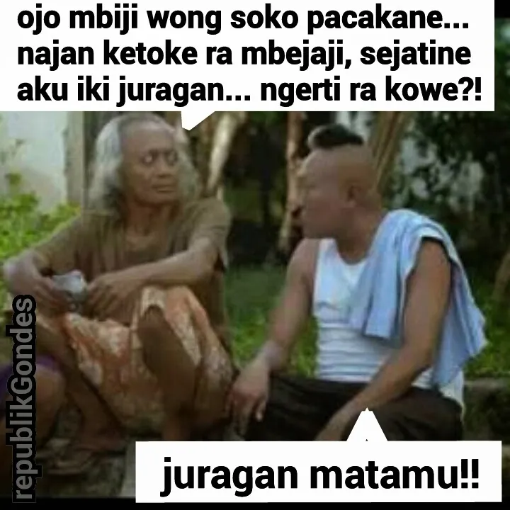 Percakapan ini terkesan lucu karena ada kontras antara ucapan orang pertama yang memberikan pesan bijak tentang tidak menilai seseorang dari penampilannya, dan jawaban orang kedua yang mengatakan bahwa sebenarnya dia adalah juragan dan bertanya apakah lawannya mengerti. Mereka saling bergurau dengan bahasa Jawa yang khas dan humor yang mengundang senyuman.