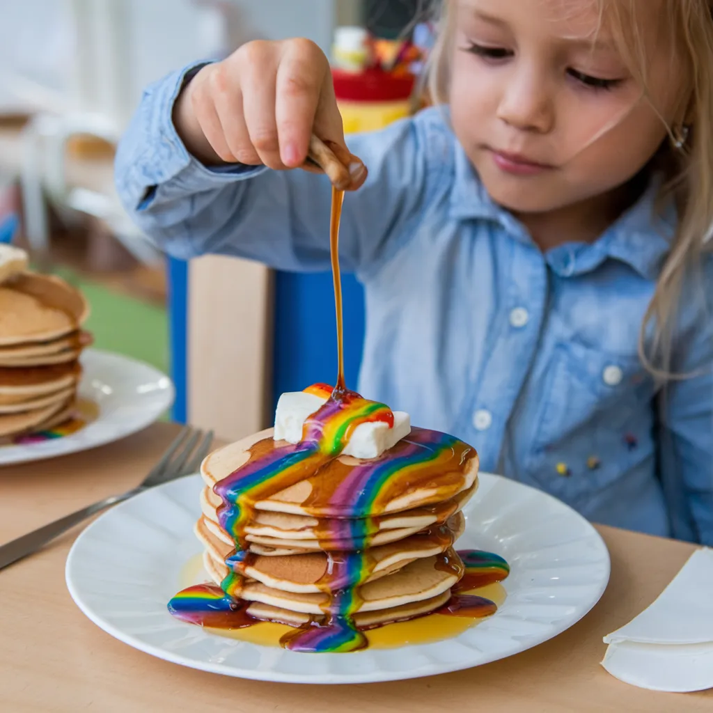 Gambarkan pancake bertumpuk dengan sirup pelangi yang mengalir di atasnya, memberikan kesan manis dan penuh warna.