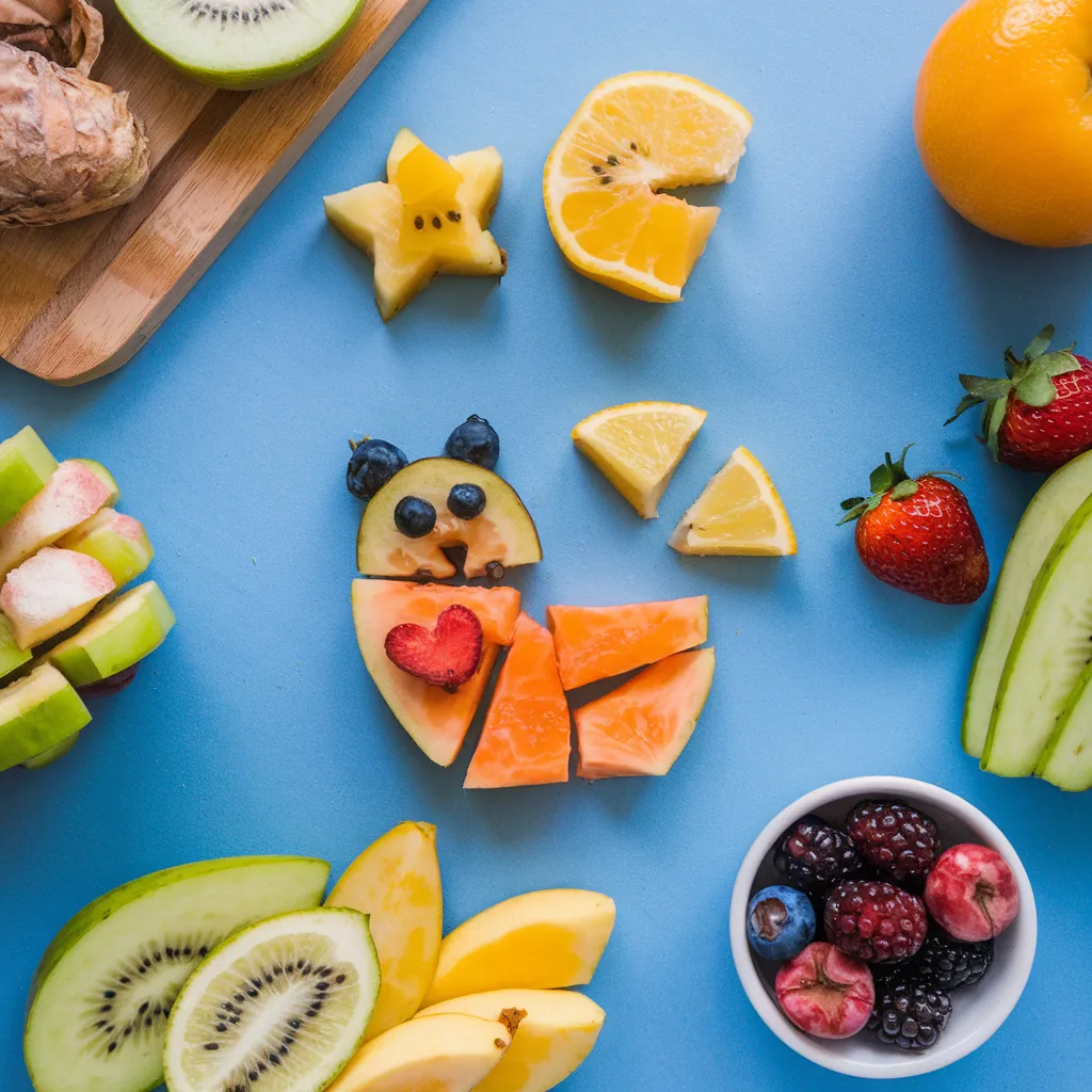 Ilustrasikan potongan buah seperti apel, jeruk, dan anggur yang dibentuk menjadi hewan-hewan lucu seperti kura-kura atau singa.