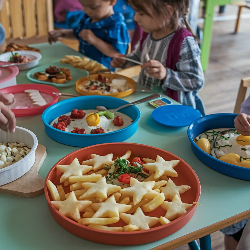 Gambarkan kentang goreng yang dipotong dan disusun dalam bentuk bintang, memberikan tampilan yang unik dan menyenangkan.