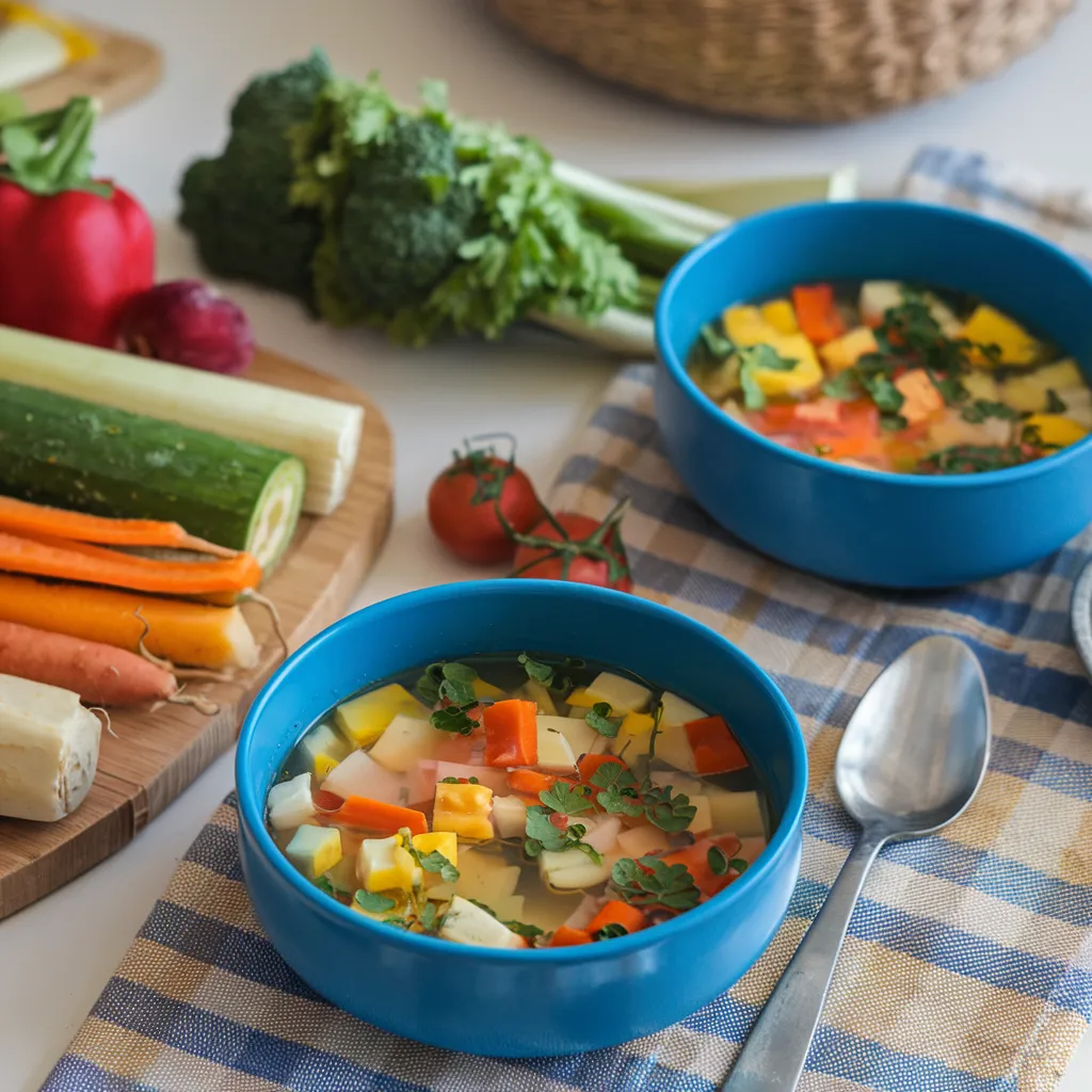 Ilustrasikan mangkuk sup sayuran yang penuh dengan sayuran berwarna-warni seperti wortel, jagung, dan kacang polong, menonjolkan nutrisi yang kaya.
