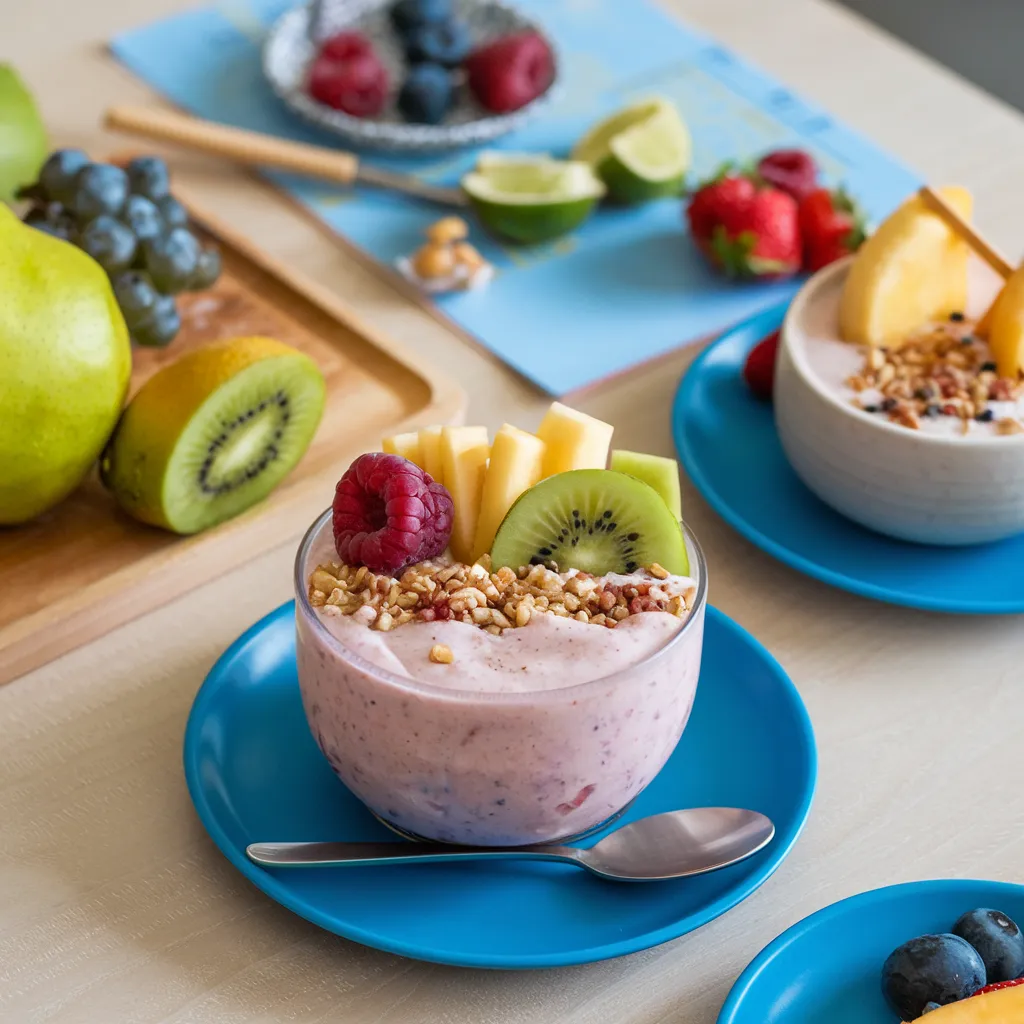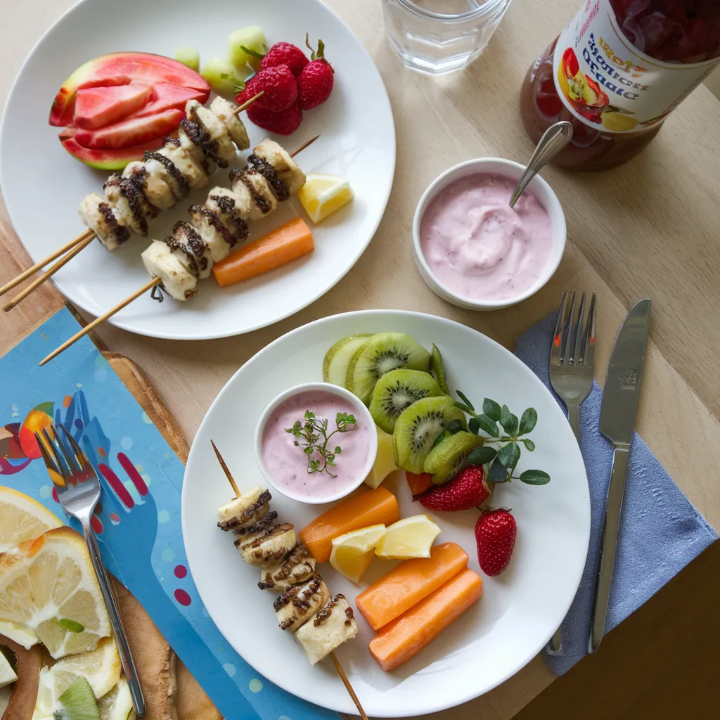 Tambahkan saus yogurt di sekitar sate buah, menciptakan tampilan yang segar dan sehat untuk camilan anak-anak.