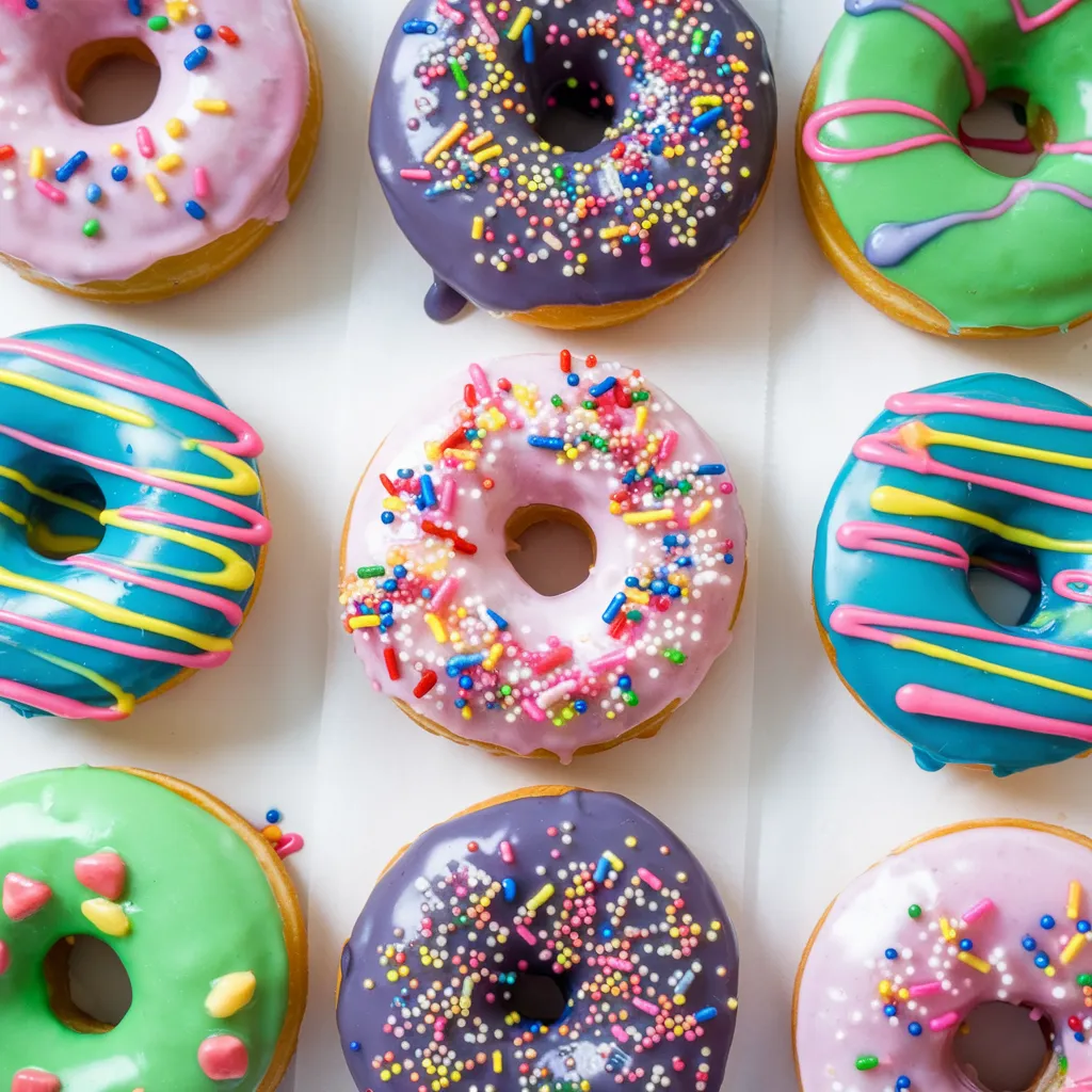 Ilustrasikan donat yang dilapisi glaze berwarna-warni, memberikan kesan ceria dan menggoda.
