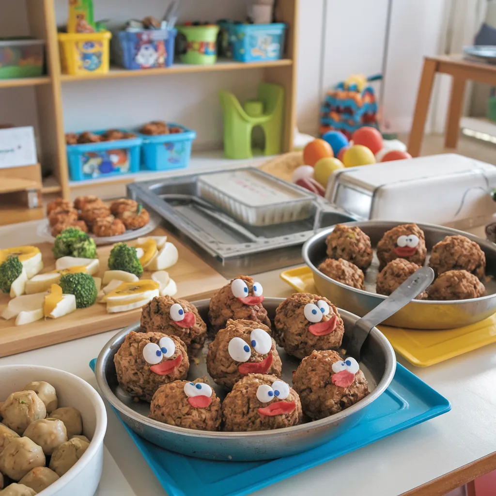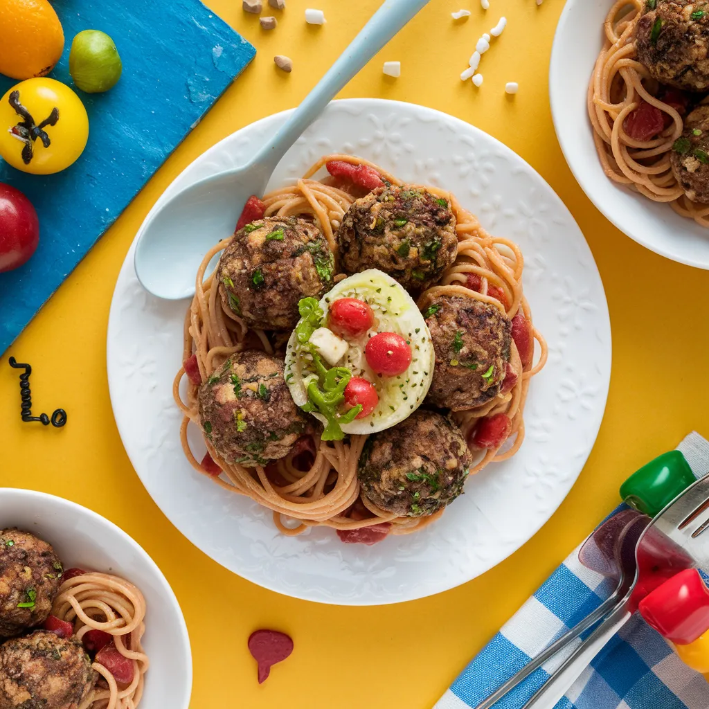 Gambarkan spaghetti dengan bola daging yang memiliki ekspresi wajah lucu, membuat hidangan klasik ini lebih menyenangkan untuk dilihat.