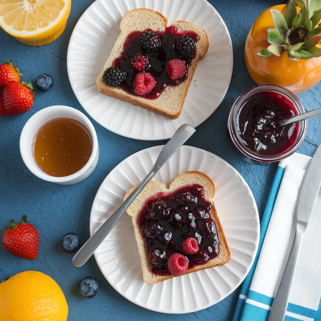 Gambarkan roti bakar yang diolesi selai berry dengan topping buah segar, menciptakan tampilan yang manis dan sehat.