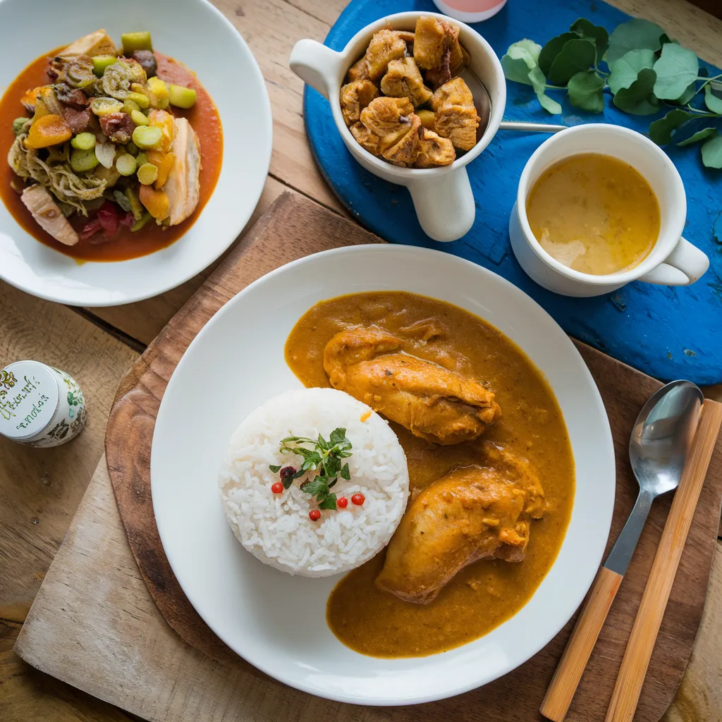 Ilustrasikan mangkuk kari ayam yang disajikan dengan nasi putih, menonjolkan kombinasi rasa yang lezat dan menggugah selera.