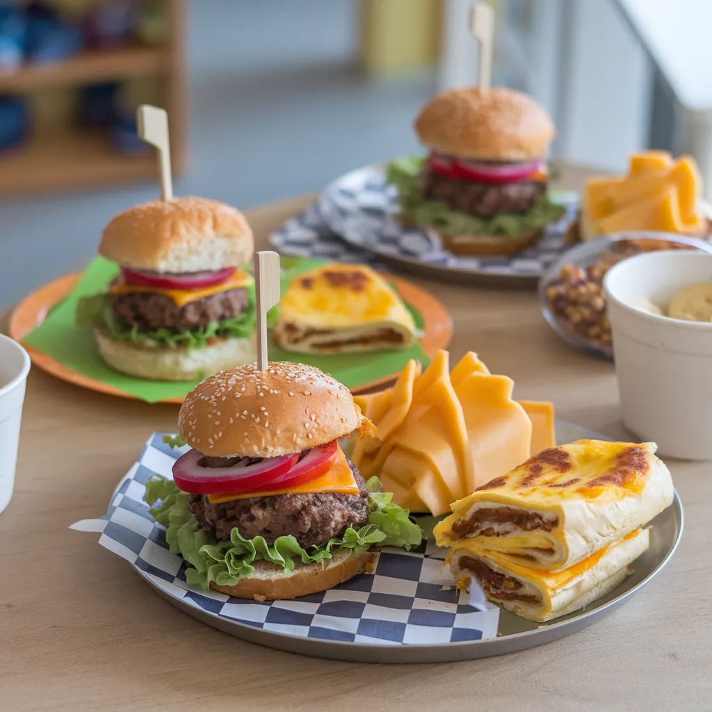 Ilustrasikan burger kecil dengan lapisan keju yang melimpah, lengkap dengan sayuran segar dan roti yang lembut, memberikan kesan menggoda.