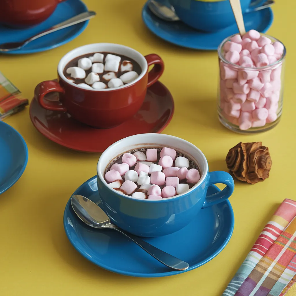 Tambahkan marshmallow yang melimpah di atas cokelat panas, menciptakan tampilan yang hangat dan menyenangkan.