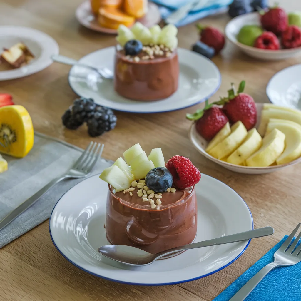 Gambarkan puding cokelat yang dihias dengan potongan buah segar, memberikan kesan manis dan sehat.