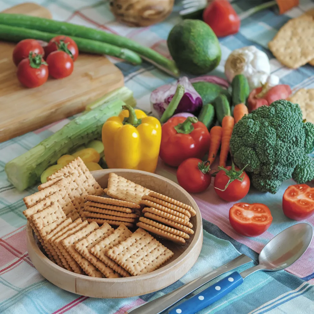 Ilustrasikan piring kerupuk yang disajikan dengan berbagai sayuran segar seperti wortel, timun, dan tomat, menciptakan kombinasi yang renyah dan sehat.